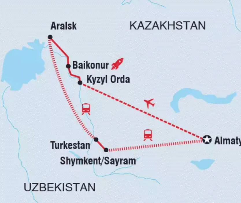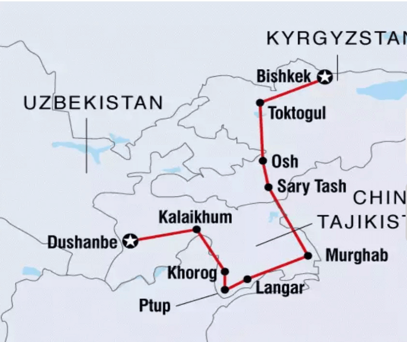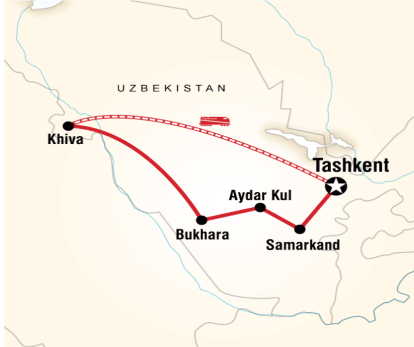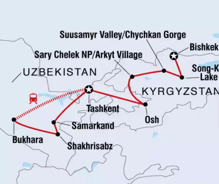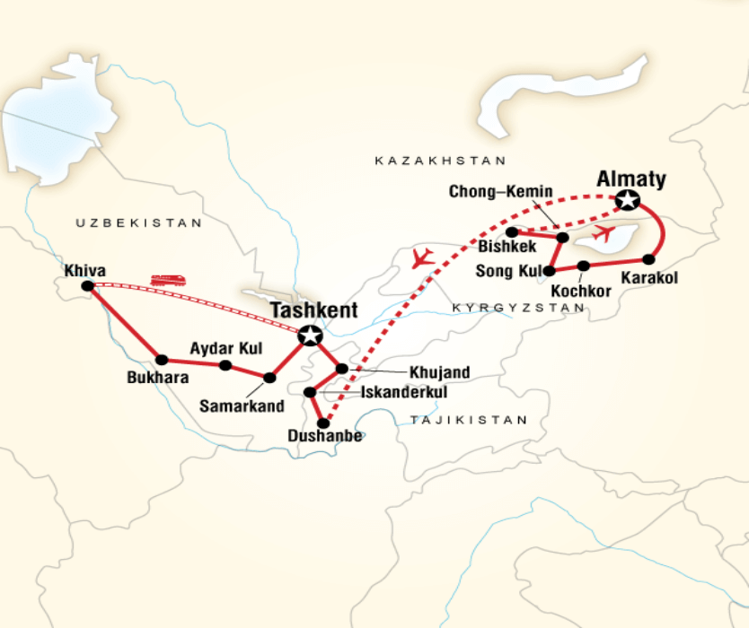 Tashkent, Samarkand, Bukhara, Khiva, Almaty, Tiyanshan Mountains, Bishkek, Issyk Kul Lake area,